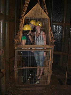 mit diesem hochwerigen fahrstuhl werden die arbeiter in den schacht befoerdert: