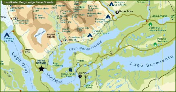 der zweite tag war auf jeden fall etwas interessanter. es ging zum glacier grey (also der linke weg vom sternchen). und dann auch wieder zurueck. insgesamt ca 22 km. das wetter war zwar wieder etwas besser, aber es gab auch kleine schaauer zwischendurch. daher gingen wir auf nummer sicher und haben auch diese nacht im shinig hotel verbracht.